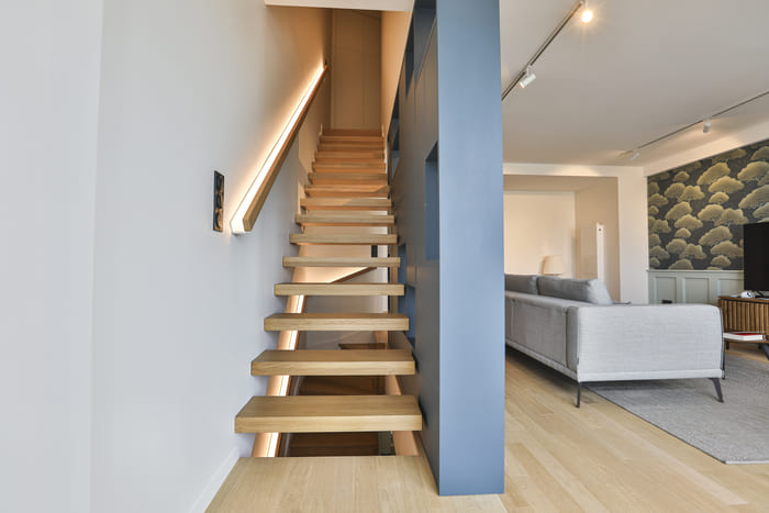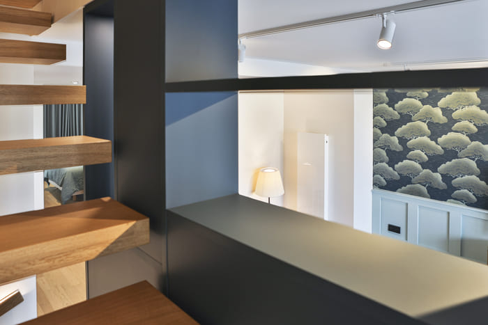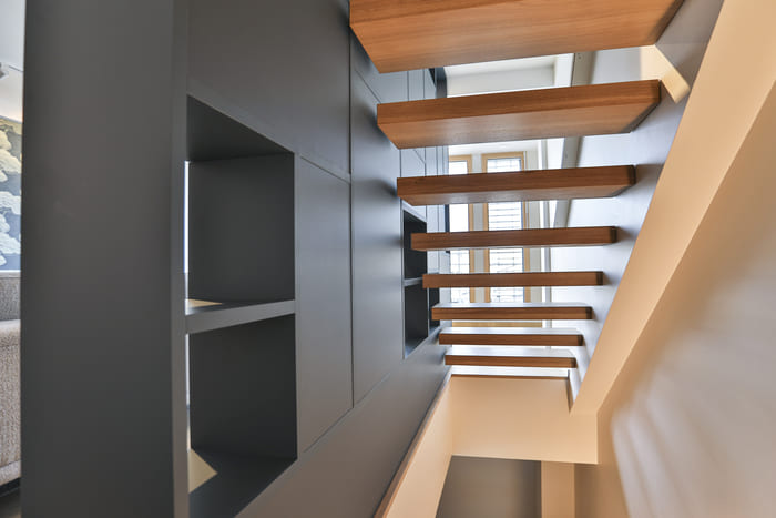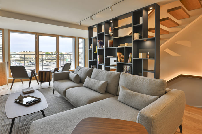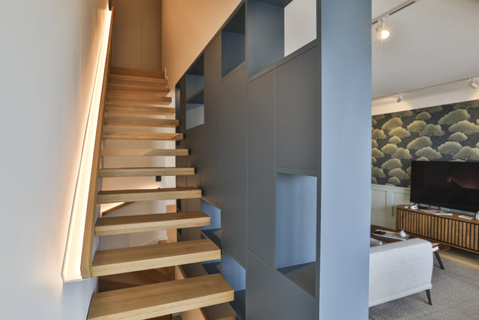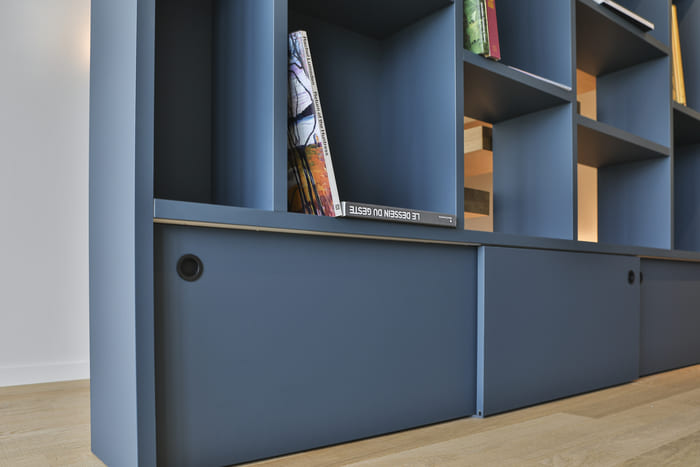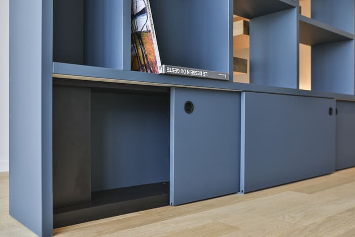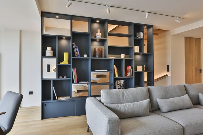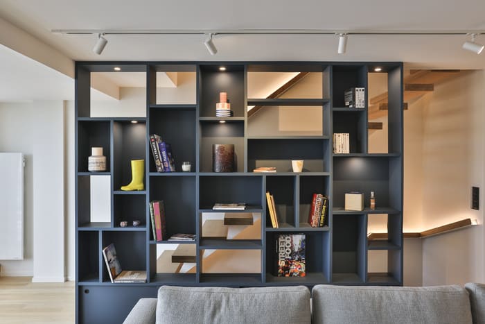 Cet agencement de bibliothèque est à la fois moderne et fonctionnel, avec une structure ouverte qui sert de séparation entre deux espaces. Les niches de rangement asymétriques apportent du dynamisme, tandis que les étagères de différentes tailles permettent d’exposer livres et objets décoratifs. Le choix d’une couleur sombre, combinée à un éclairage intégré, met en valeur les éléments disposés tout en créant une ambiance chaleureuse. Le bas de la bibliothèque est doté de rangements fermés pour un aspect pratique et minimaliste, parfaitement adapté à un intérieur contemporain.