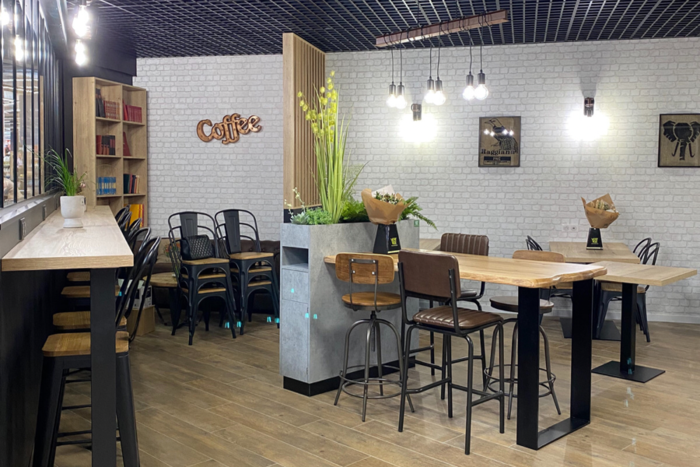 Cet agencement de coffee shop mise sur une ambiance chaleureuse et industrielle. Les matériaux en bois clair, alliés à des éléments métalliques noirs, créent un décor moderne et convivial. Les tables et chaises de style industriel, combinées à une décoration sobre, renforcent l’atmosphère décontractée. L’espace de vente met en avant des produits soigneusement disposés sur des étagères en bois, tandis que les lumières suspendues ajoutent une touche cosy et accueillante.