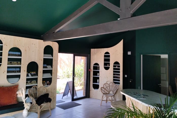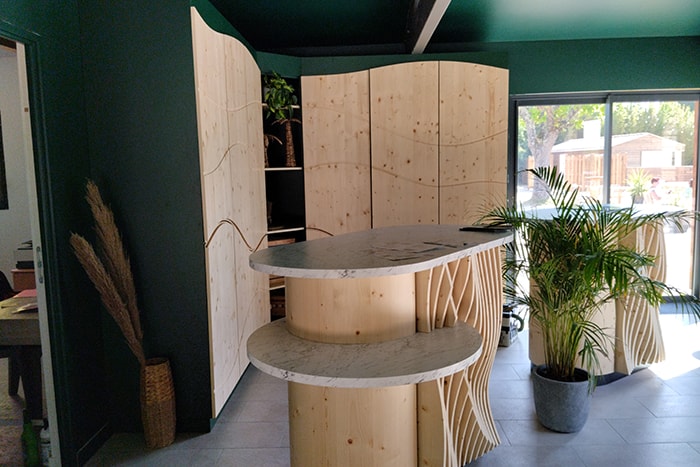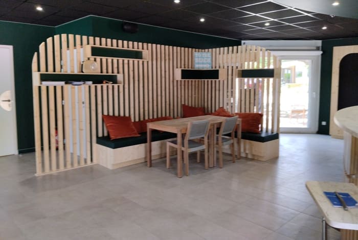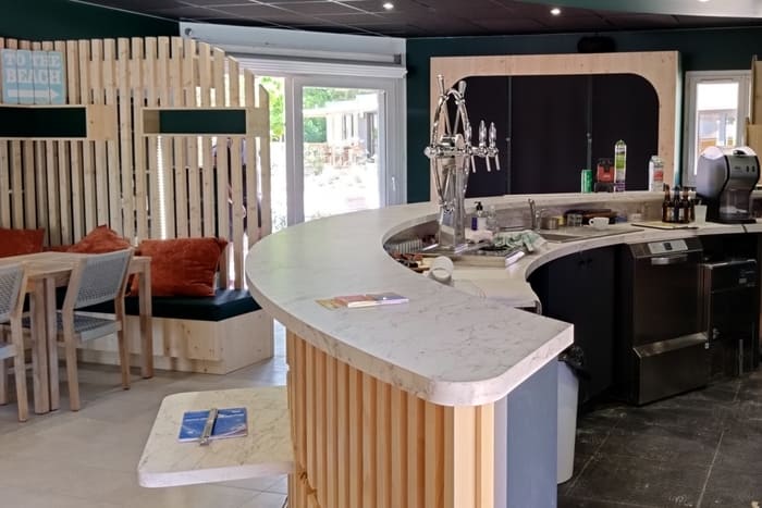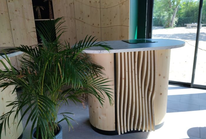 - Le comptoir d'accueil, réalisé avec une structure en épicéa, et son plateau en polyrey « calacatta » qui apporte une touche contemporaine