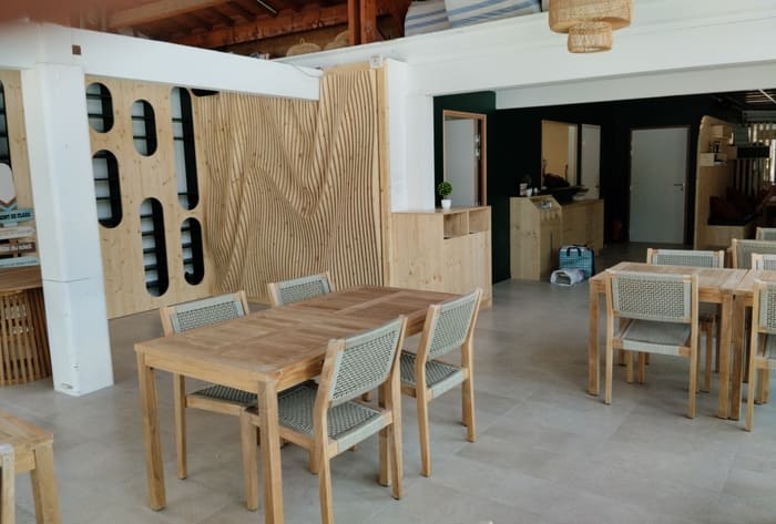 - L'habillage mural en lames épicéa donne un aspect texturé et authentique à l'espace d'accueil