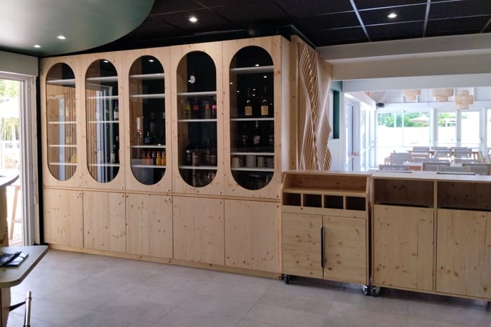 - La banquette, dotée d'une façade cintrée replaquée en épicéa, crée une atmosphère accueillante et conviviale