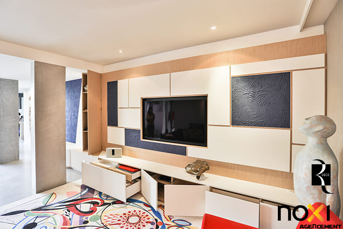 - Création sur mesure d’un habillage mural autour d’un écran de télé pour une mise en relief grâce aux associations de matières