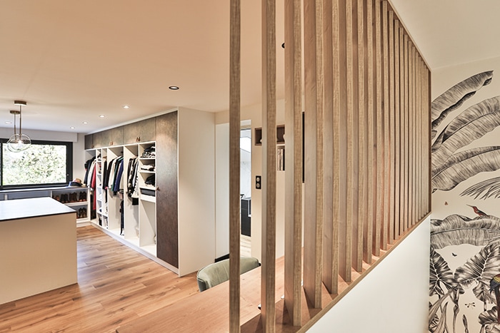 Un bureau ouvert sur la chambre parentale avec un claustra pour séparer les différents espaces.